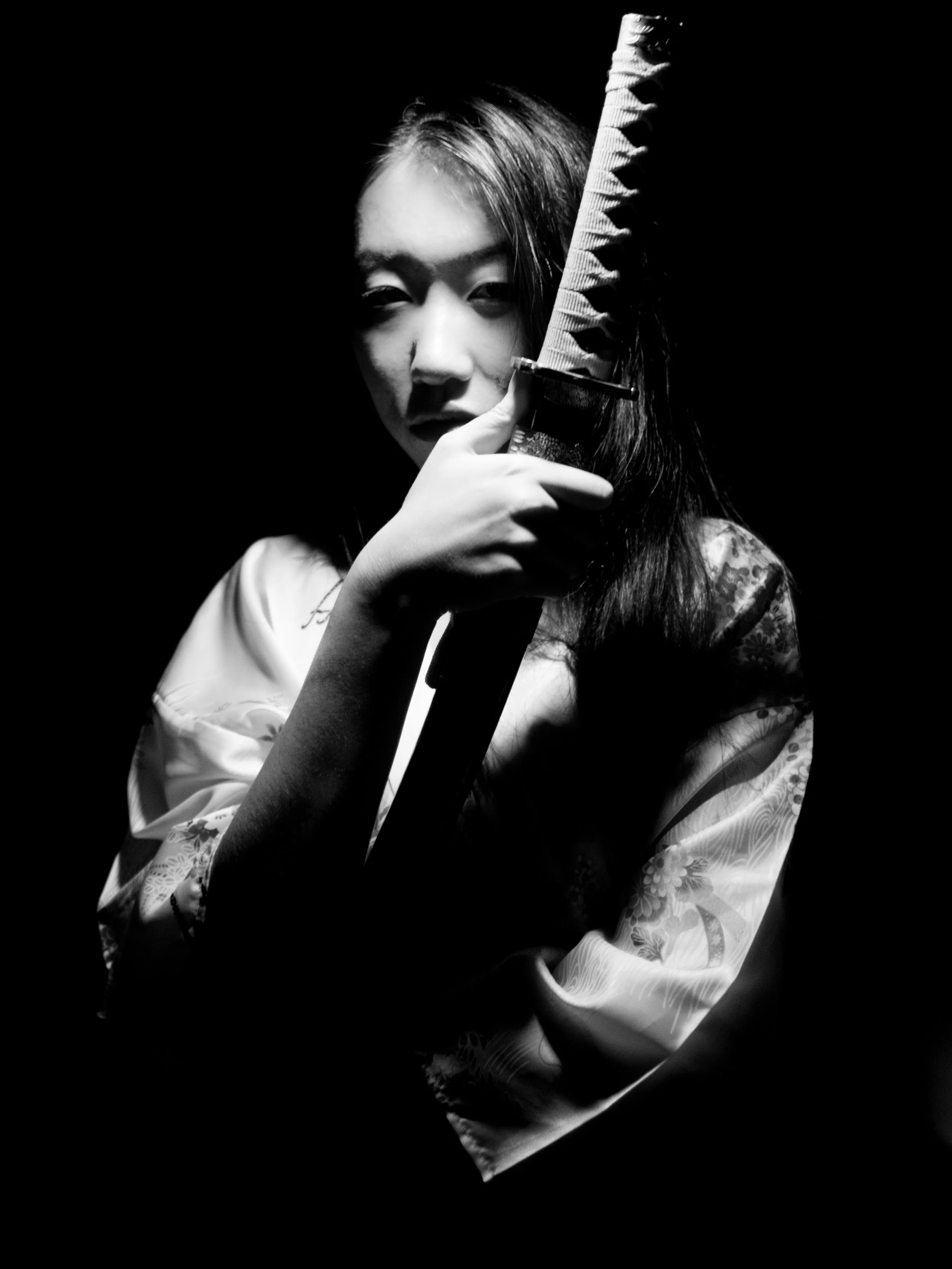 Close-up of a cat's face and body, in black and white, with focus on fur and eye details.