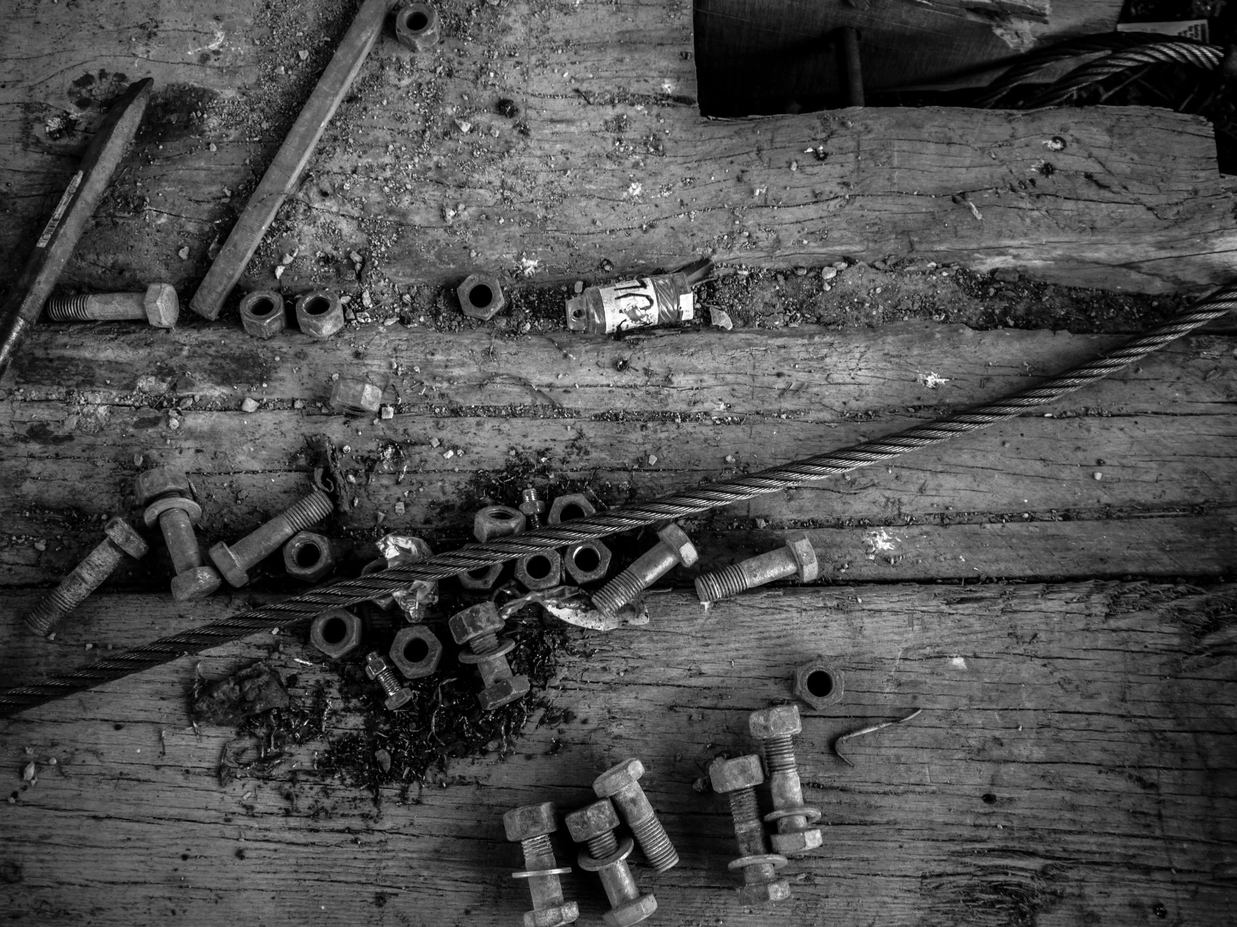 Black and white silhouette of farm structures, including a water tank on the left, trees, and a building on the right, under a bright sky.
