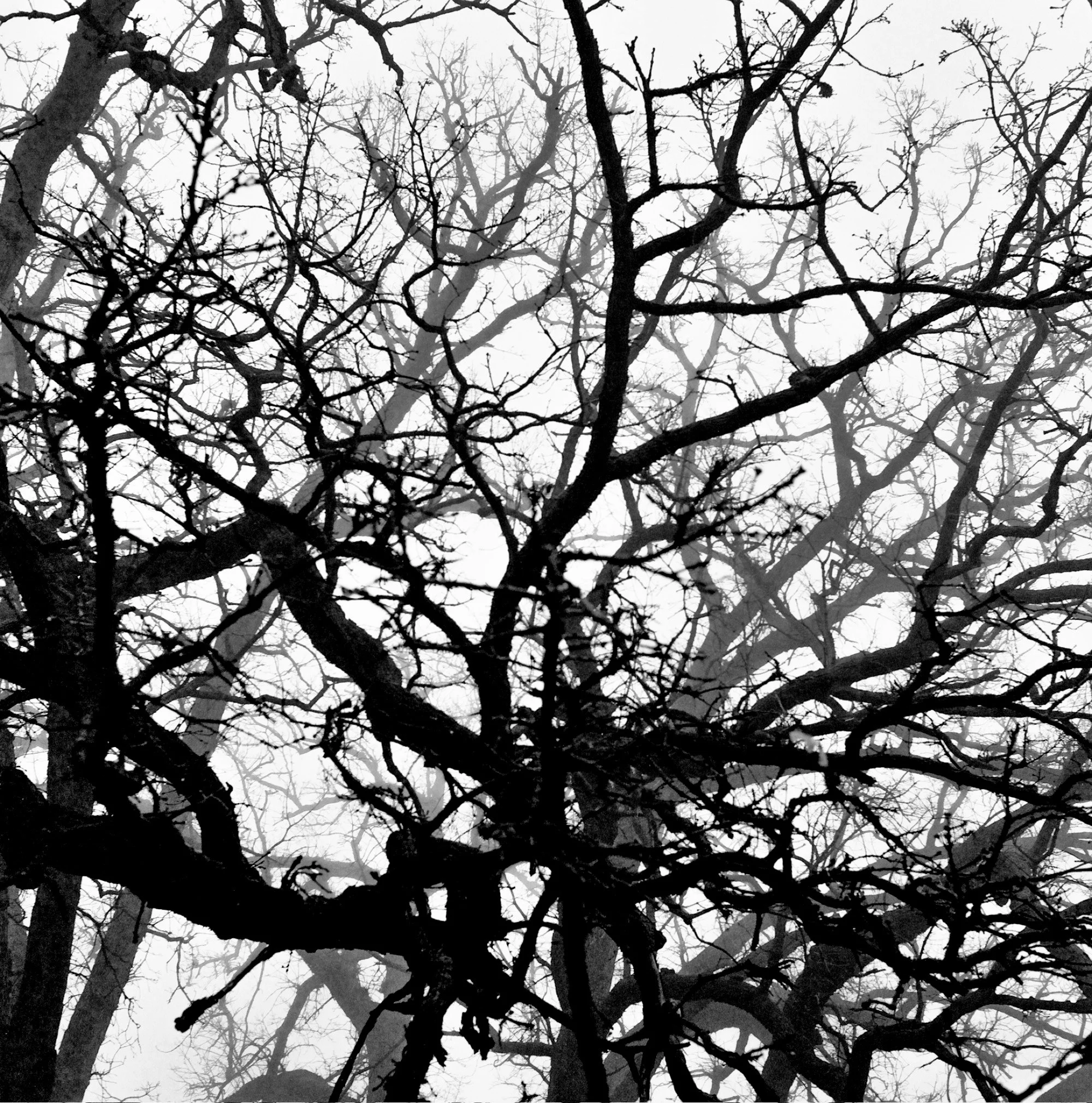 Black silhouette of leafless trees on a cloudy sky, with multiple intertwined branches, viewed from below, creating a complex, branching pattern.