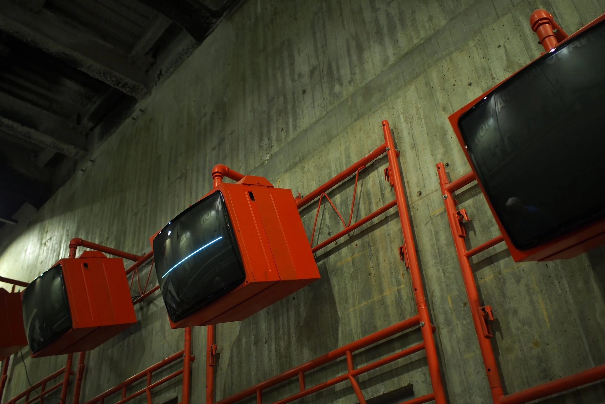 Three black and orange electronic displays mounted on a red metal frame against a concrete wall in an industrial environment.