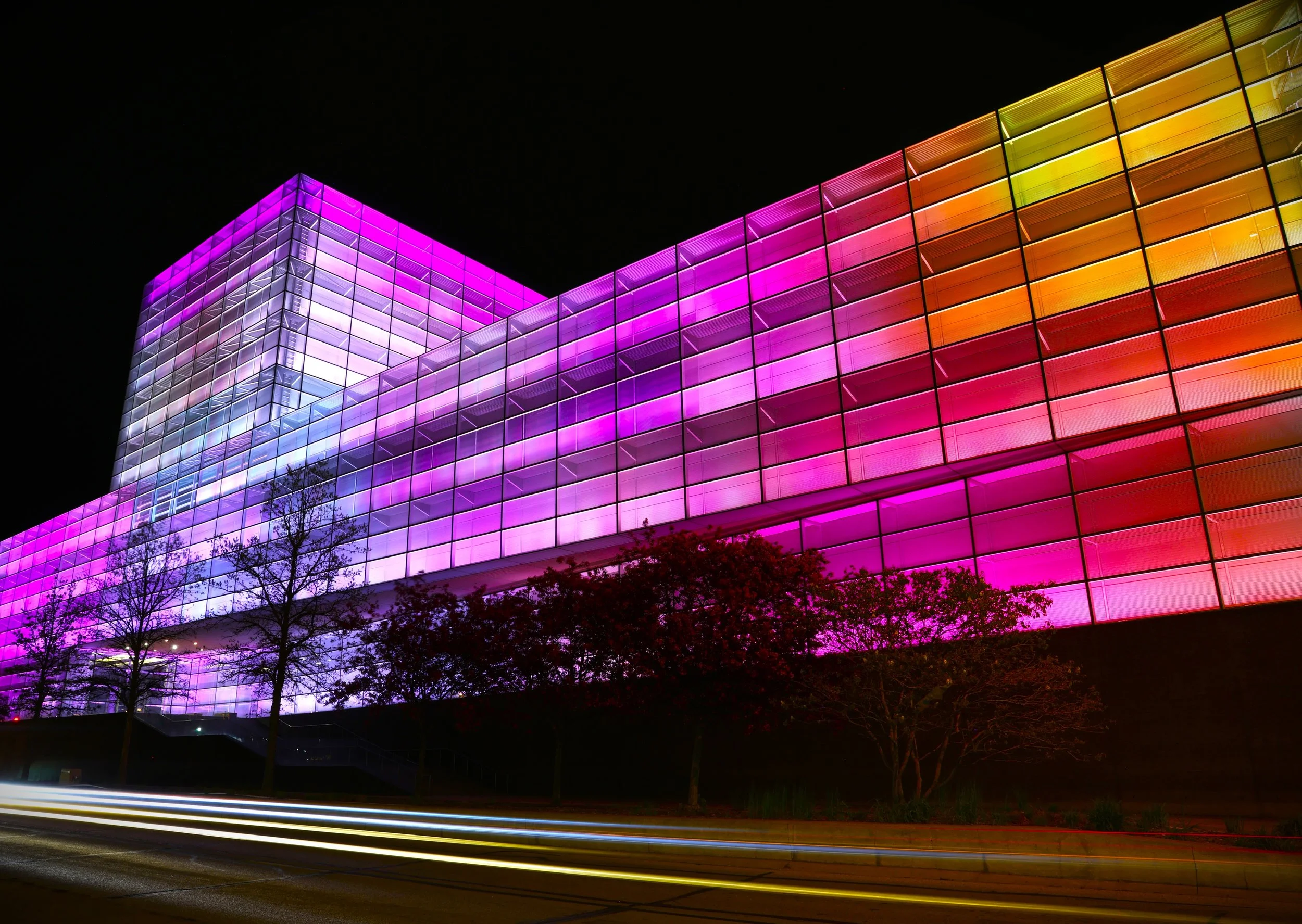 Colorfully lit modern building at night with purple, pink, orange, and yellow lights, and trees in the foreground.